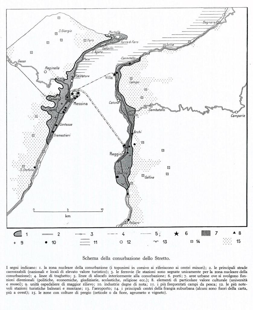 Concludendo «la conurbazione dello Stretto è ai nostri giorni una realtà chiara e sicura. E nei suoi riguardi lo Stretto non è più uno spazio marino, ma un fiume le cui coste sono ricoperte da una duplice sequenza di densi abitati14». Un’opportunità per questo immenso territorio per crescere nei diversi settori, da quello turistico, entrambe le città ospitano rinomati complessi balneari, a quello della ricerca con i due poli universitari e la vocazione viva fin dal nascita di questi insediamenti cioè quella commerciale.