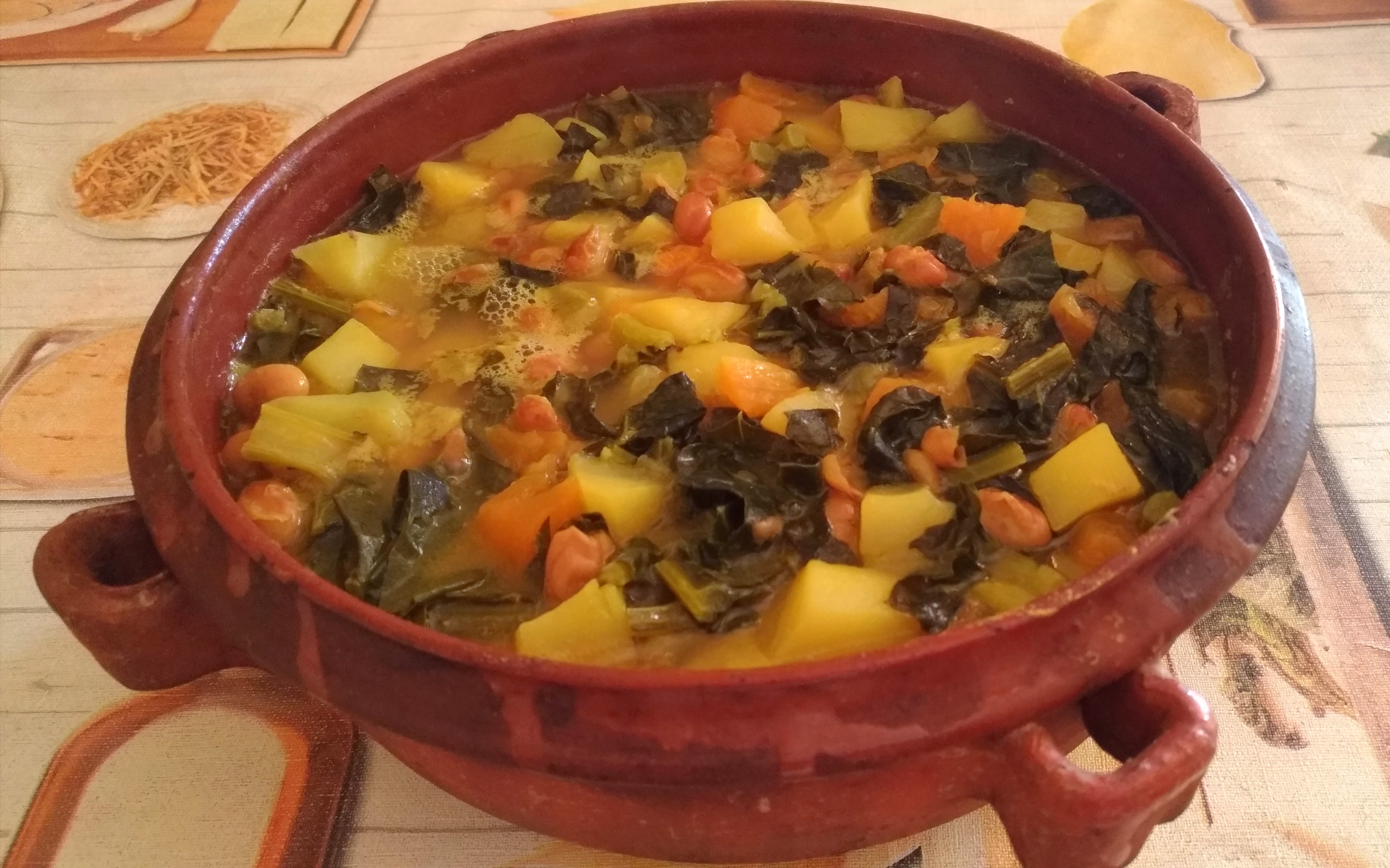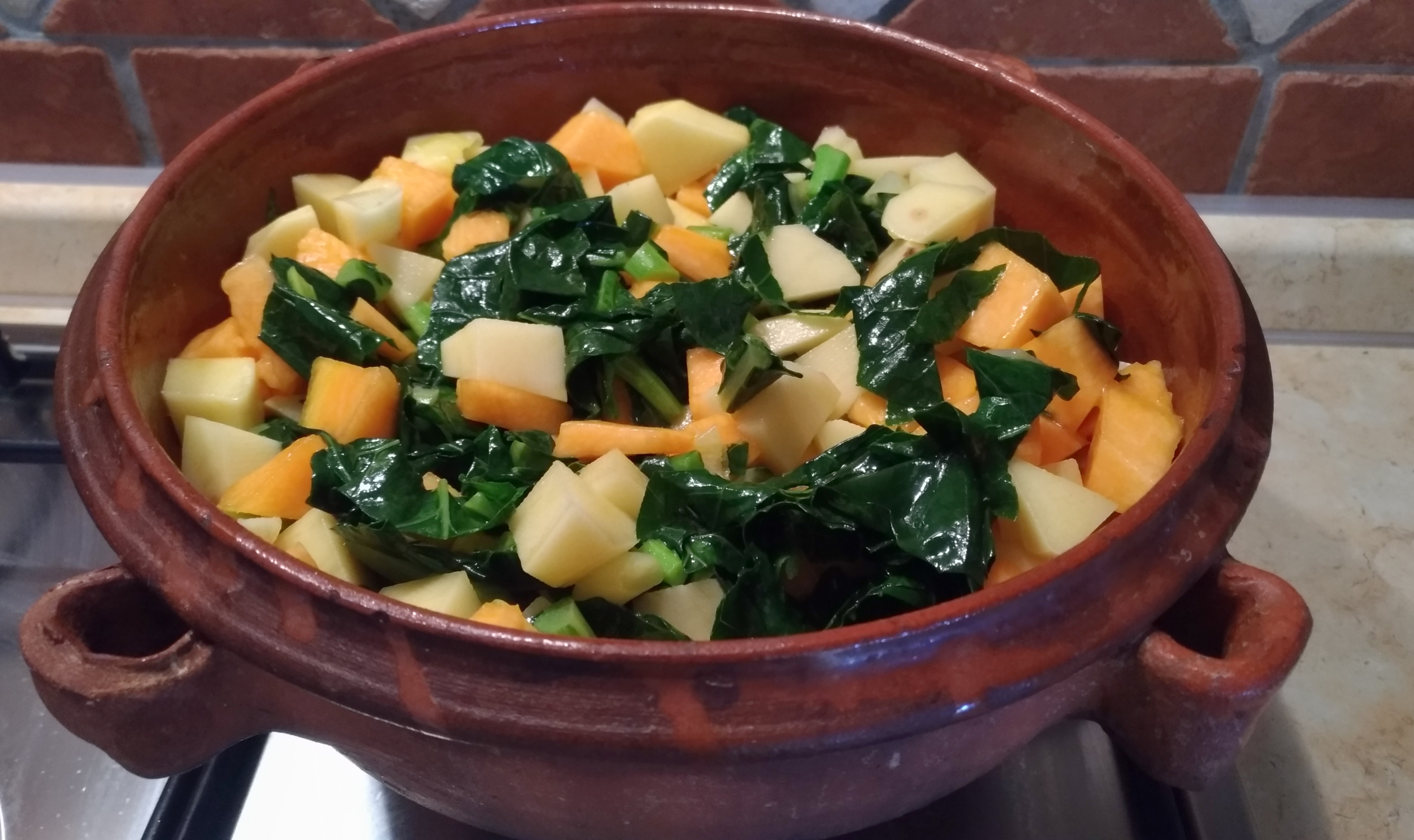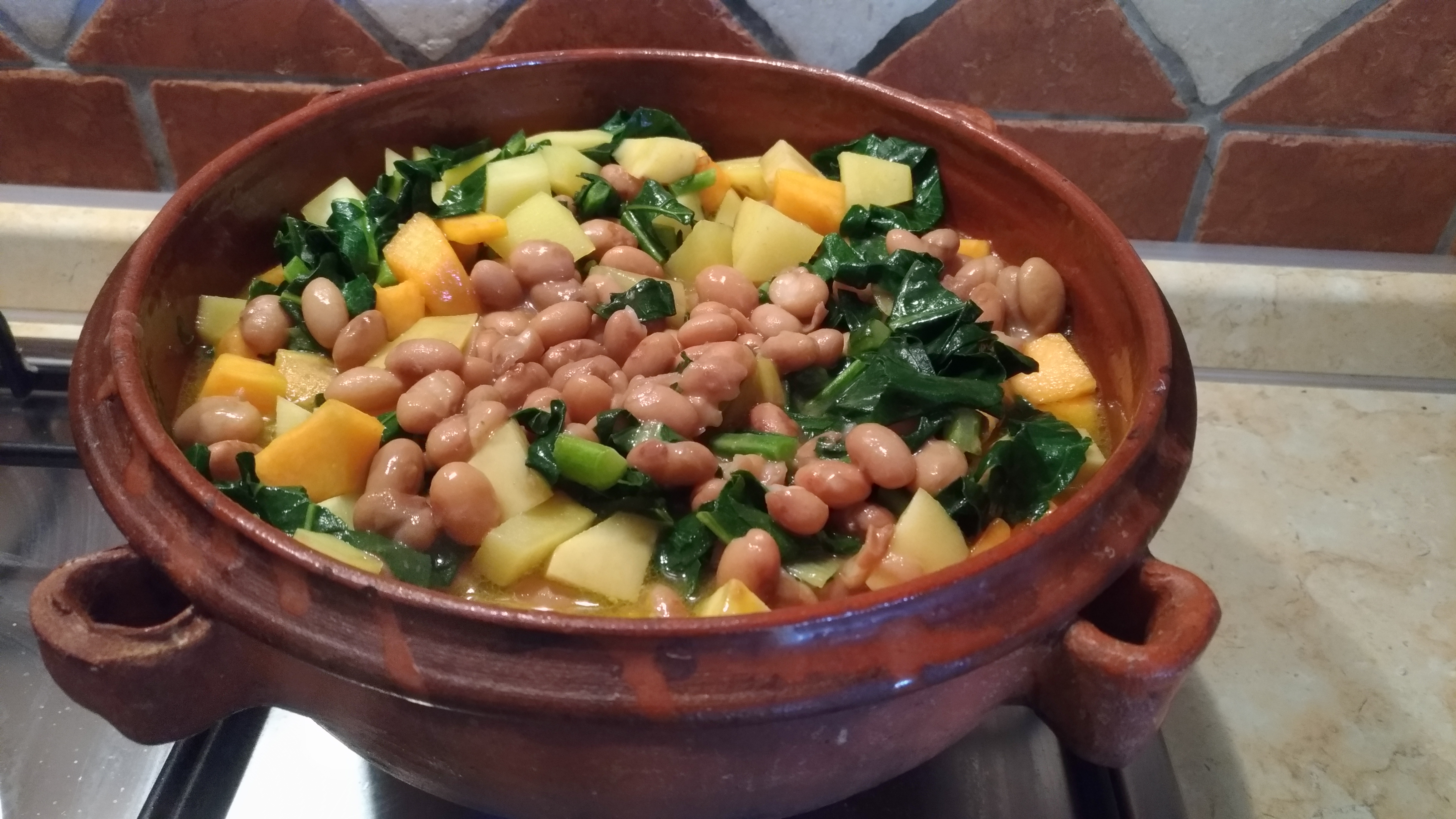 Prendere un tegame e versare un giro di olio extravergine d’oliva, l’aglio a fettine sottili, le foglie di cavalo tagliate a piccoli pezzi e 3 dita di acqua. Quando le foglie di cavolo si saranno ammorbidite aggiungete le patate e la zucca affettate a quadrotti ed i fagioli che avrete cotto in precedenza.
