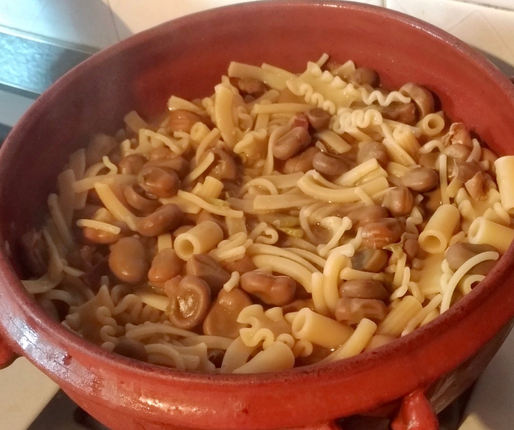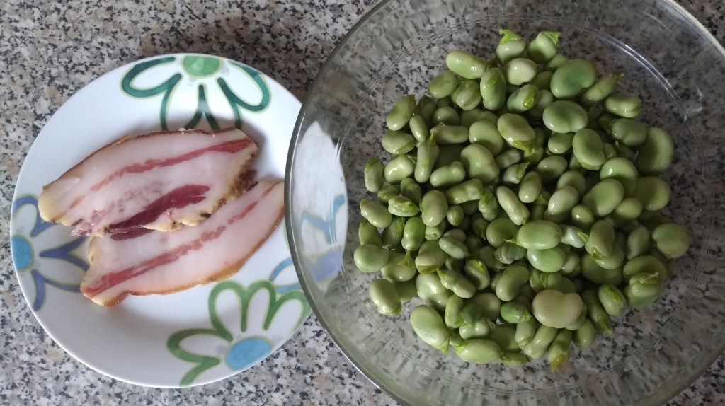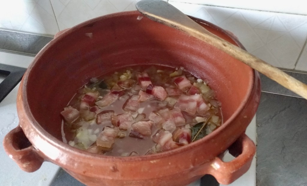 Tra storie e ricordi comincio ad affettare 2/3 cipollotti freschi e li adagio nel tegame in terracotta con un filo d’olio extravergine d’oliva, del guanciale nostrano tagliato a cubetti ed una foglia di alloro. Piano piano la cipolla appassisce e l’alloro mi inebria di profumo la cucina; è il momento di aggiungere le fave e di farle soffriggere per una decina di minuti. Infine aggiungo acqua quanto basta, salo il tutto e faccio cuocere per almeno un oretta o comunque finché le fave non saranno cotte.
